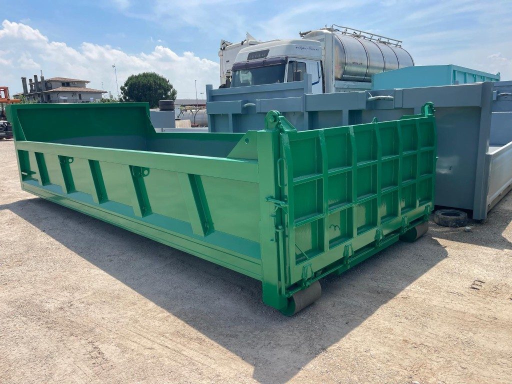 TITOLO: CONTAINER NUOVO SCARRABILE VASCA SQUADRATA SENZA SMUSSI INTERNI, APERTURA POSTERIORE A PORTA UNICA A DUE EFFETTI (RIBALTABILE E A RAMPA PER SALITA MEZZI) CON TRAVI DA 200 MM E PAVIMENTO IN APPOGGIO.GANCIO DA 0,60 MT, RUOTE MAGGIORATE E RINFORZO NELLA PARTE CENTRALE ESTERNA DELLA MEZZERIA PIU’ RINFORZO NELLA PARTE ANTERIORE NEL PUNTO DI SNERVATURA