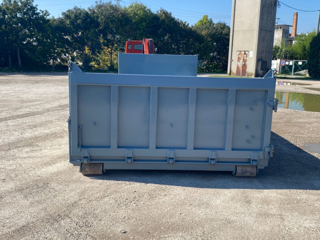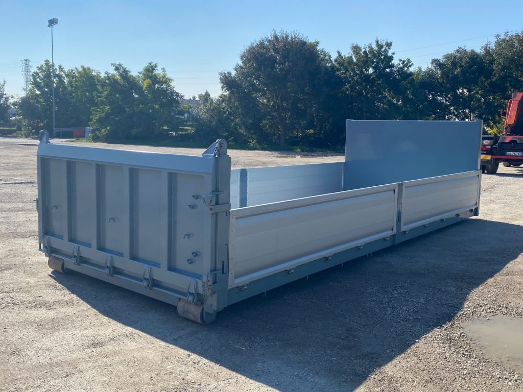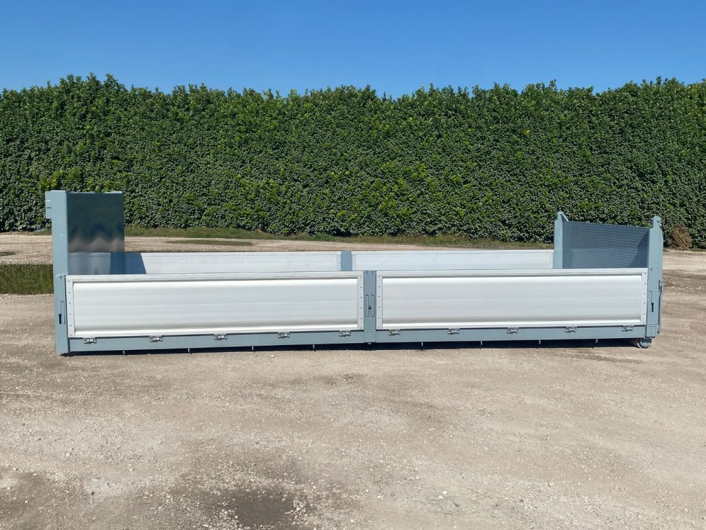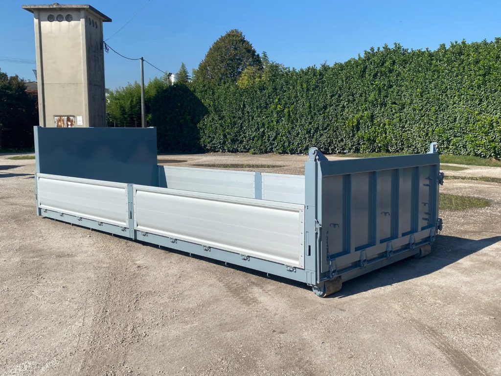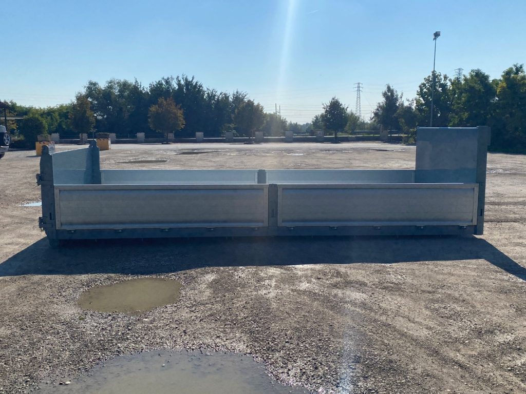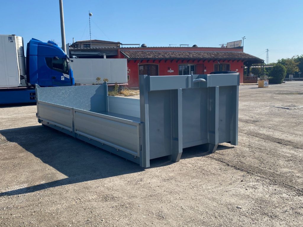 TITOLO: CONTAINER NUOVO A PIANALE CON PIANTONI RIMOVIBILI IN FERRO E DUE SPONDE PER LATO IN TR5 E SPONDA POSTERIORE IN FERRO A 3 EFFETTI A LIBRO, RIBALTABILE VERSO L’ALTO E RIBALTABILE VERSO IL BASSO CON FONDO MANDORLATO E TRAVI IN APPOGGIO DA 200 MM CON 2 GANCI DI ANCORAGGIO INTERNI A SCOMPARSA