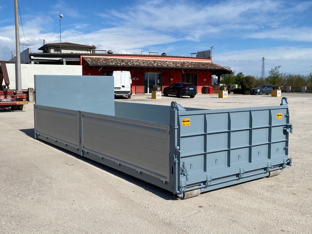 TITOLO: CONTAINER NUOVO A PIANALE CON PIANTONI RIMOVIBILI IN FERRO CON DUE SPONDE PER LATO IN TR5 E SPONDA POSTERIORE IN FERRO A 3 EFFETTI A LIBRO, RIBALTABILE VERSO L’ALTO E RIBALTABILE VERSO IL BASSO CON FONDO MANDORLATO E TRAVI IN APPOGGIO DA 200 MM CON 2 GANCI DI ANCORAGGIO INTERNI A SCOMPARSA