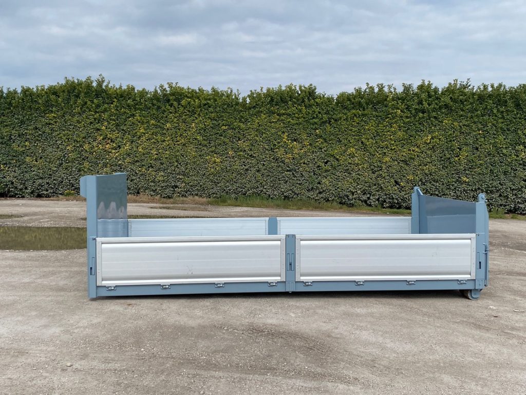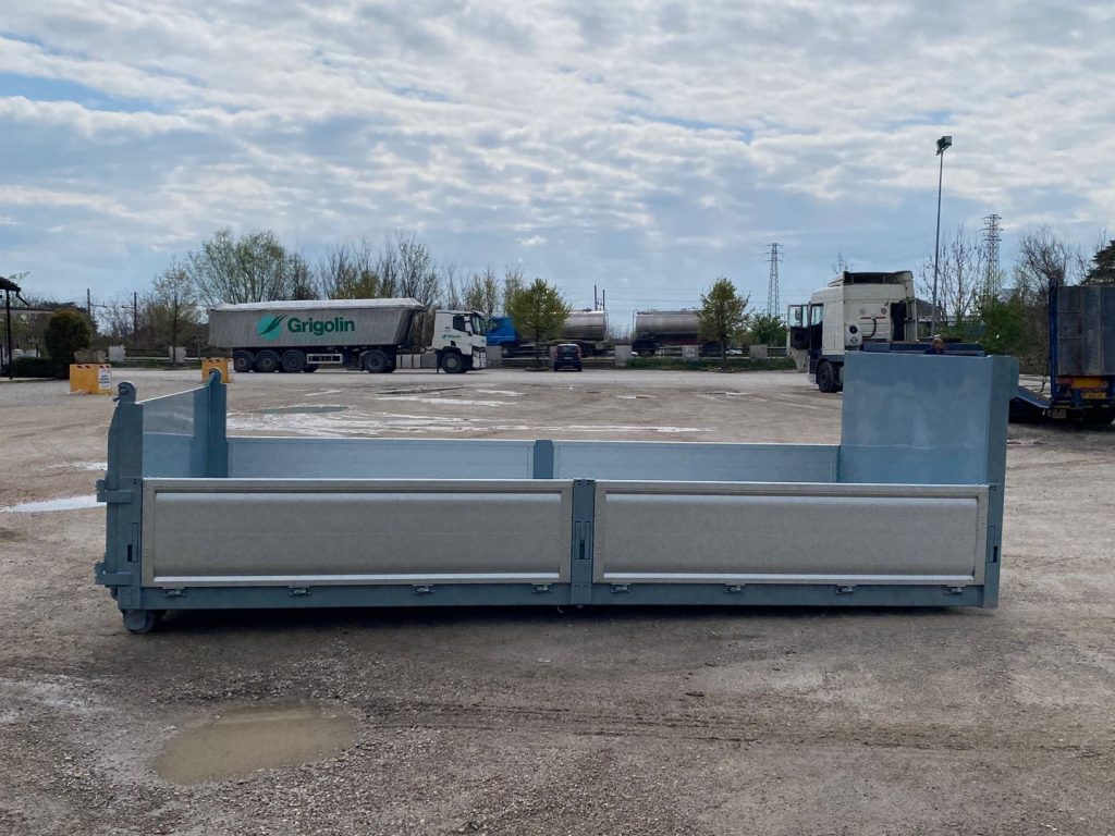 TITOLO: CONTAINER NUOVO A PIANALE CON PIANTONI RIMOVIBILI IN FERRO E DUE SPONDE PER LATO IN TR5 E SPONDA POSTERIORE IN FERRO A 3 EFFETTI A LIBRO, RIBALTABILE VERSO L’ALTO E RIBALTABILE VERSO IL BASSO CON TRAVI IN APPOGGIO DA 200 MM