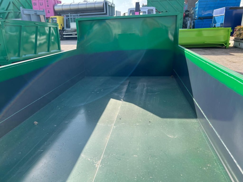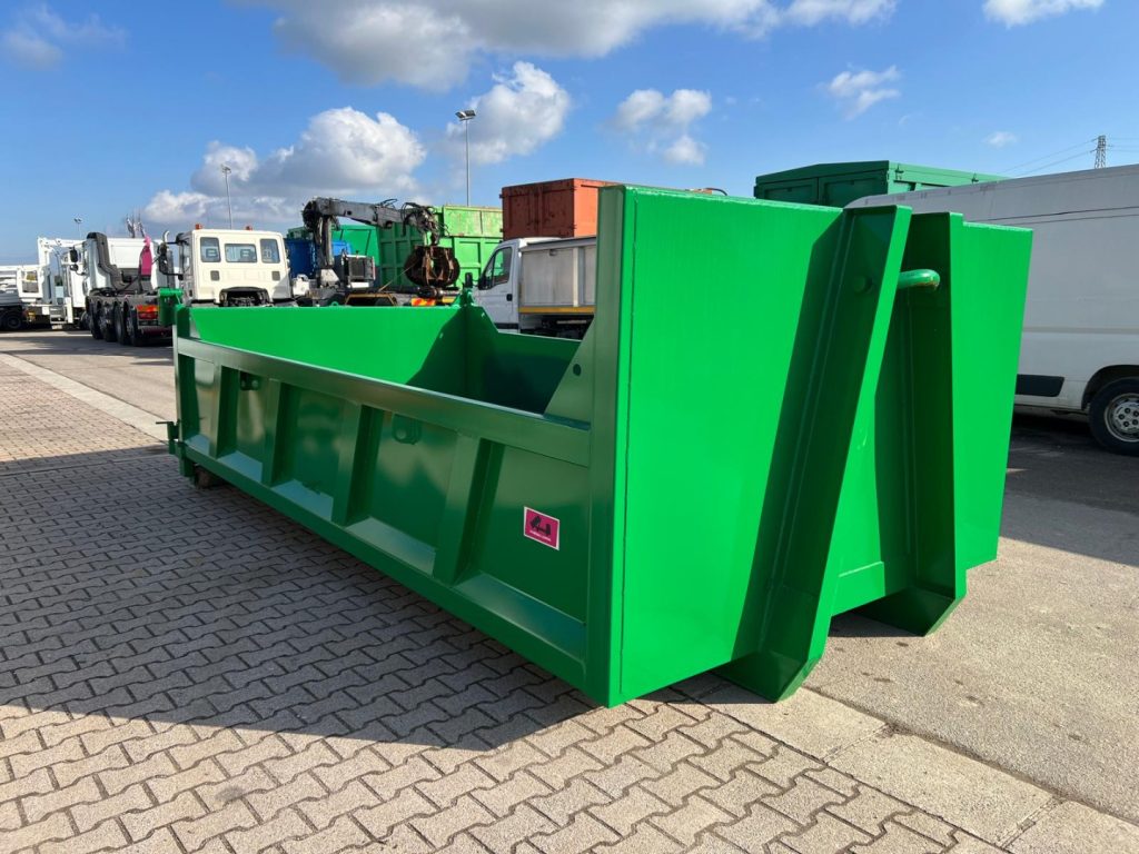 TITOLO: CONTAINER NUOVO SCARRABILE A CIELO APERTO PER INERTI A VASCA SQUADRATA SENZA SMUSSI, APERTURA POSTERIORE ANTA E RIBALTA CON TRAVI DA 200 MM E PAVIMENTO IN APPOGGIO, RINFORZO NELLA PARTE ANTERIORE NEL PUNTO DI SNERVATURA, GANCIO DA 55 MM