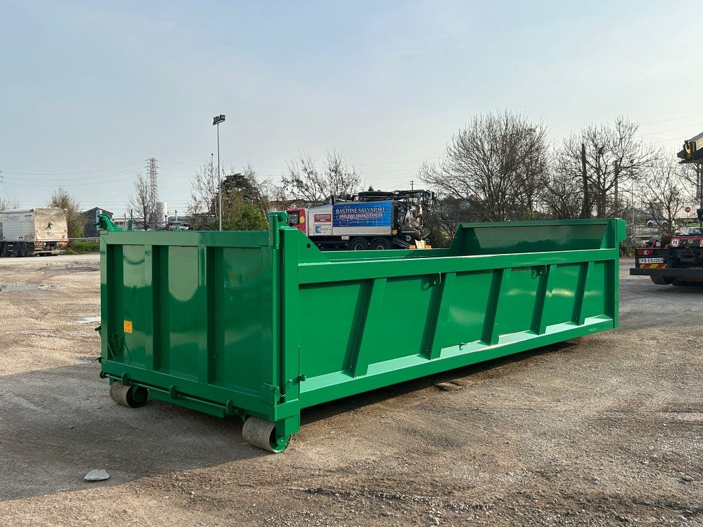 TITOLO: CONTAINER NUOVO SCARRABILE VASCA SQUADRATA APERTURA POSTERIORE ANTA E RIBALTA CON TRAVI DA 200 MM E PAVIMENTO IN APPOGGIO, GANCIO DA 0,60 MT, RUOTE MAGGIORATE E RINFORZO NELLA PARTE CENTRALE ESTERNA DELLA MEZZERIA PIU’ RINFORZO NELLA PARTE ANTERIORE NEL PUNTO DI SNERVATURA