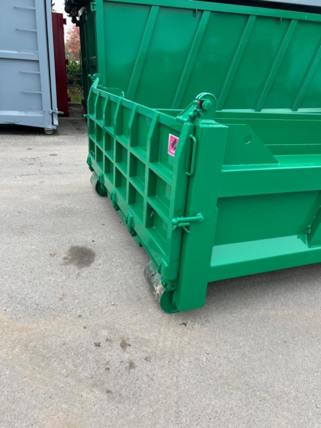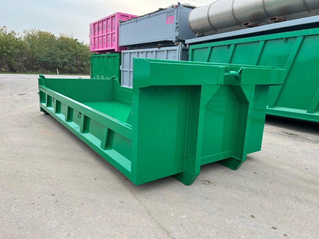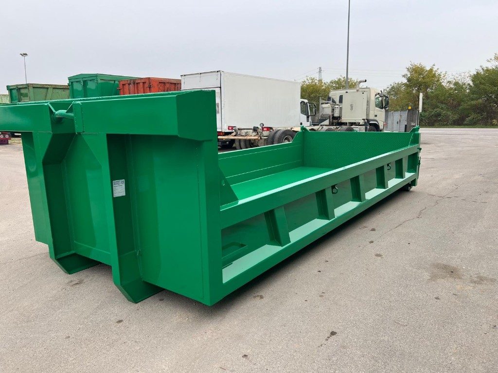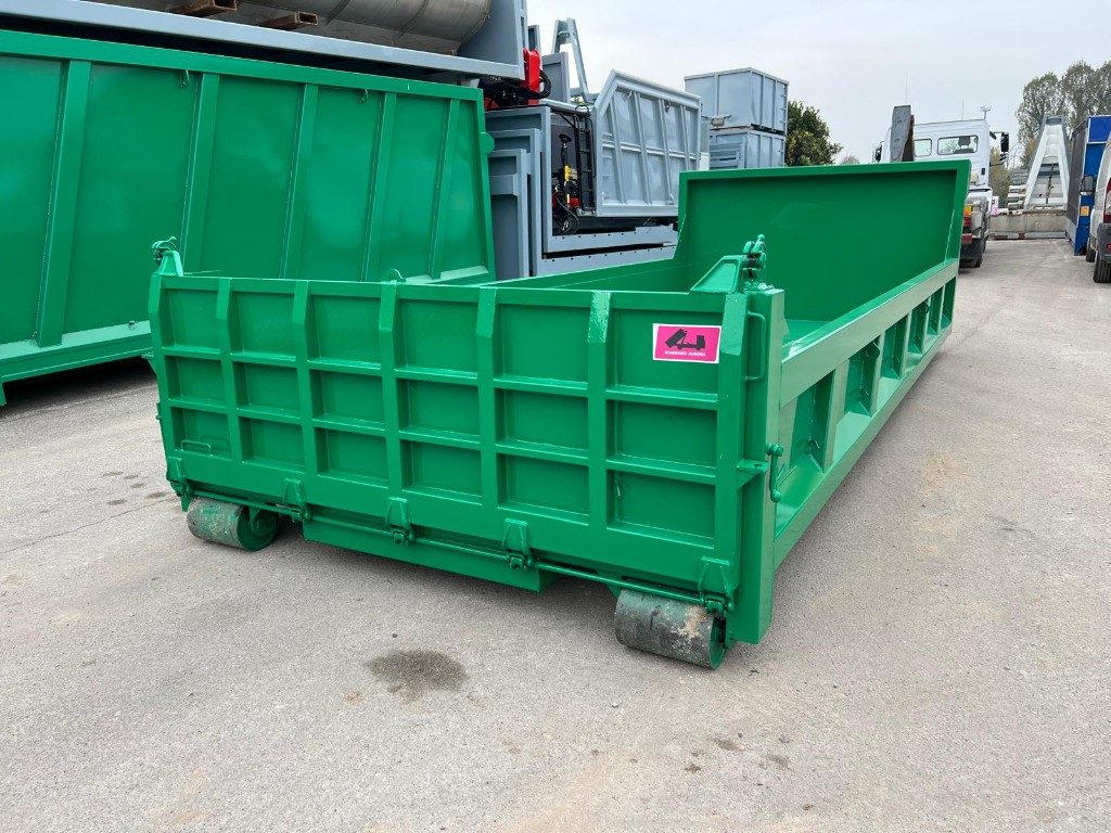 TITOLO: CONTAINER NUOVO SCARRABILE VASCA SQUADRATA APERTURA POSTERIORE CON RIBALTA VERSO L’ALTO E VERSO IL BASSO (FUNZIONE RAMPA DI CARICO) CON TRAVI DA 200 MM E PAVIMENTO IN APPOGGIO, GANCIO DA 0,60 MT, RUOTE MAGGIORATE E RINFORZO NELLA PARTE CENTRALE ESTERNA DELLA MEZZERIA PIU’ RINFORZO NELLA PARTE ANTERIORE NEL PUNTO DI SNERVATURA