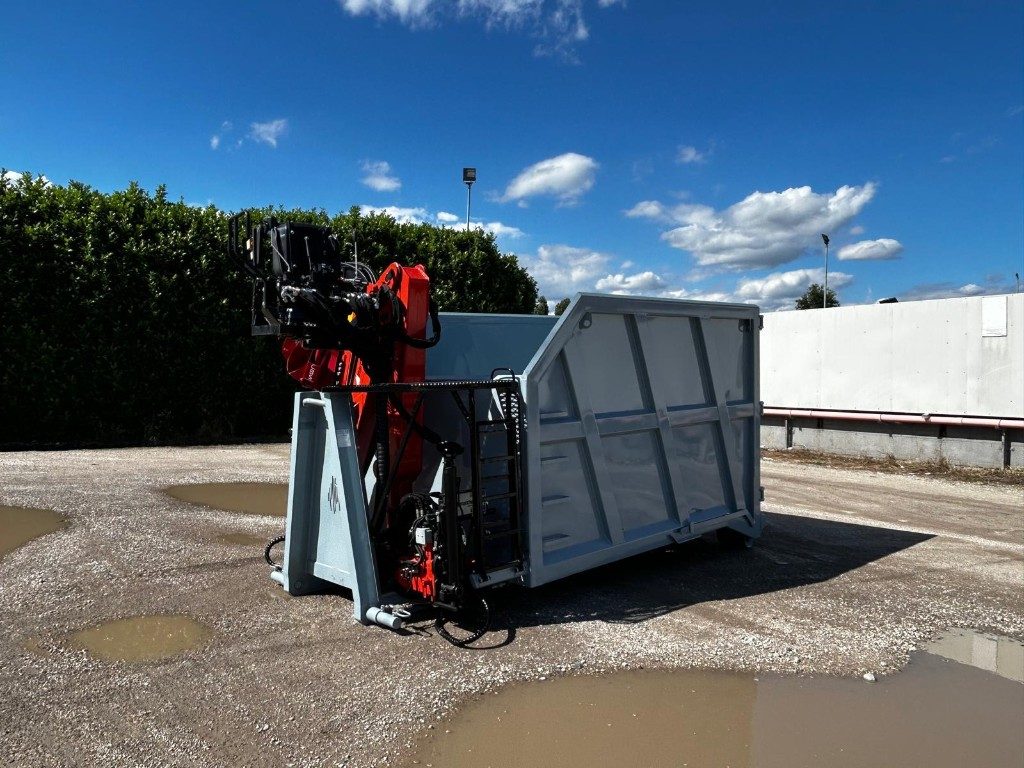 TITOLO: CONTAINER NUOVO SCARRABILE A CIELO APERTO PER INGOMBRANTI IN HARDOX E APERTURA POSTERIORE CON DUE PORTE A LIBRO, TRAVI DA 160 MM CON RINFORZO A ELLE SULLO SQUADRO PIU’ GRU NUOVA MARCHESI M6Z 02.73 E POLIPO NUOVO ROZZI 4 PALE CON ROTORE E COMANDI CON JOYSTICK