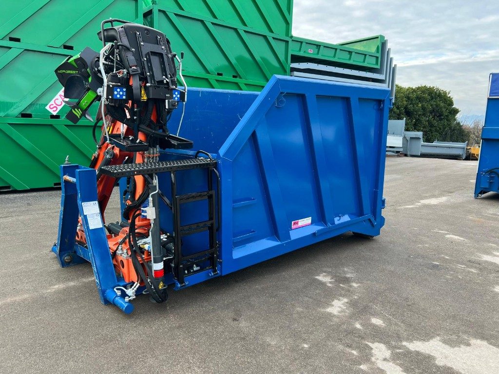 TITOLO: CONTAINER NUOVO SCARRABILE A CIELO APERTO PER INGOMBRANTI IN HARDOX E APERTURA POSTERIORE CON DUE PORTE A LIBRO E GANCIO DA 900/920 MM CON’ GRU NUOVA COPMA E POLIPO NUOVO SGF 4 PALE CON ROTORE E COMANDI CON JOYSTICK