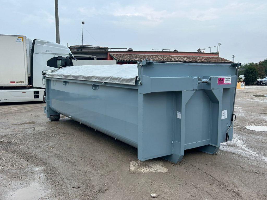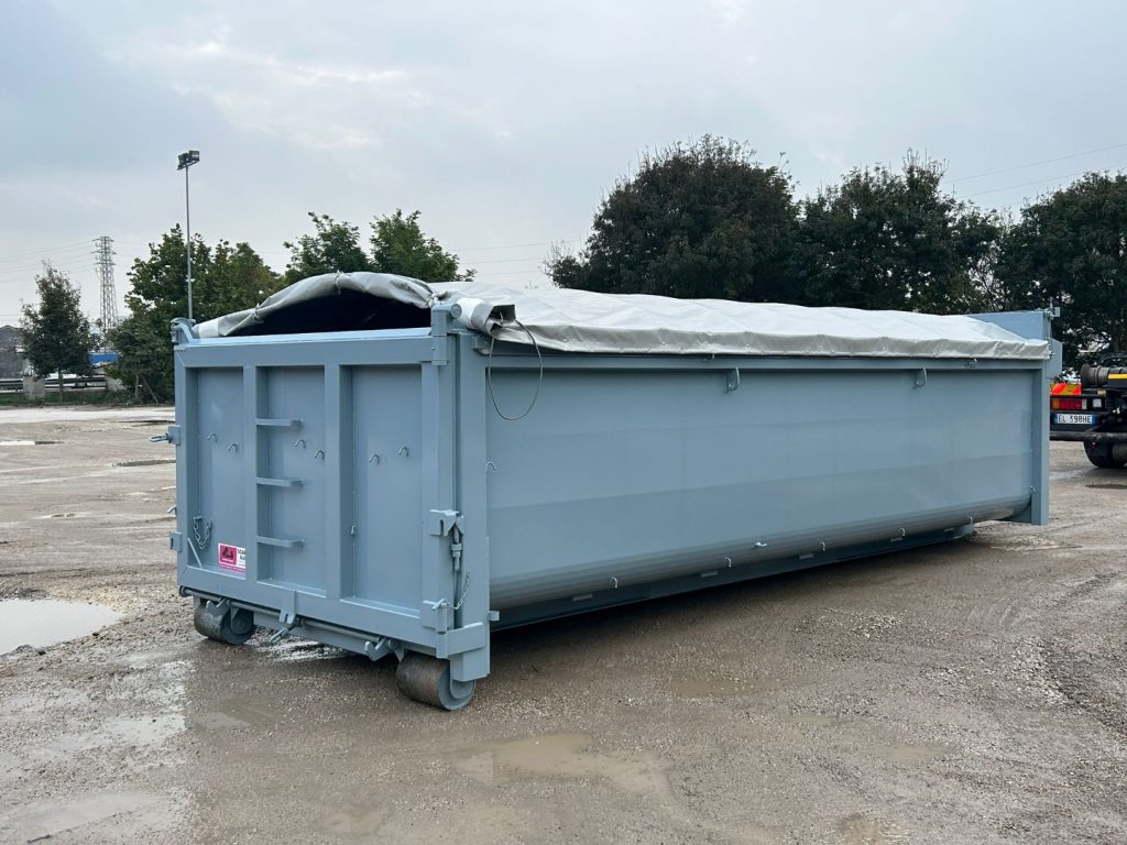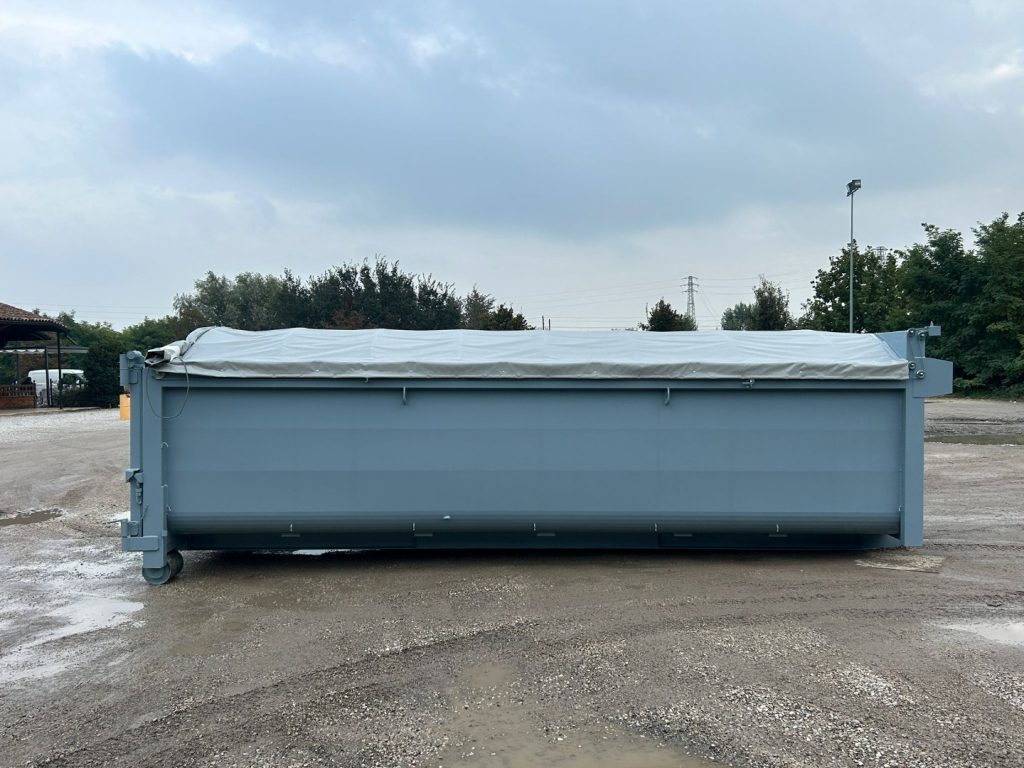 TITOLO: CONTAINER NUOVO PER INERTI CON COPRI SCOPRI ,PORTA POSTERIORE UNICA APERTURA ANTA RIBALTA STAGNO – VASCA DI ROCCIA. Adatto a caricare anche scavatori Container di forma arrotondata rinforzata con gancio maggiorato da 600 mm , rinforzo nel punto di snervatura parte anteriore, travi da 200 mm rinforzate nella parte centrale (punto di scarramento), ruote posteriori maggiorate. Fondo in appoggio alle travi con mensole laterali di supporto. Spacco di roccia sul perimetro superiore del container