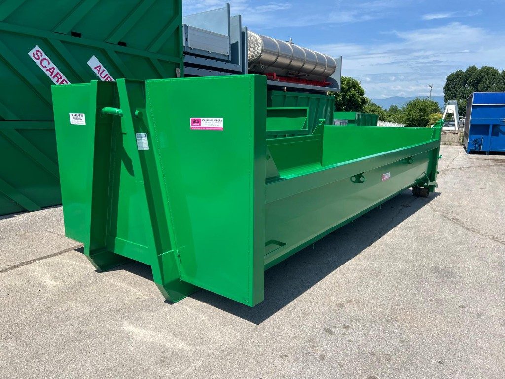 Container di forma arrotondata rinforzata con gancio da 600 mm, rinforzo nel punto di snervatura parte anteriore, travi da 200 mm. Fondo in appoggio alle travi con mensole laterali di supporto e piano di appoggio largo mt. 2,10.