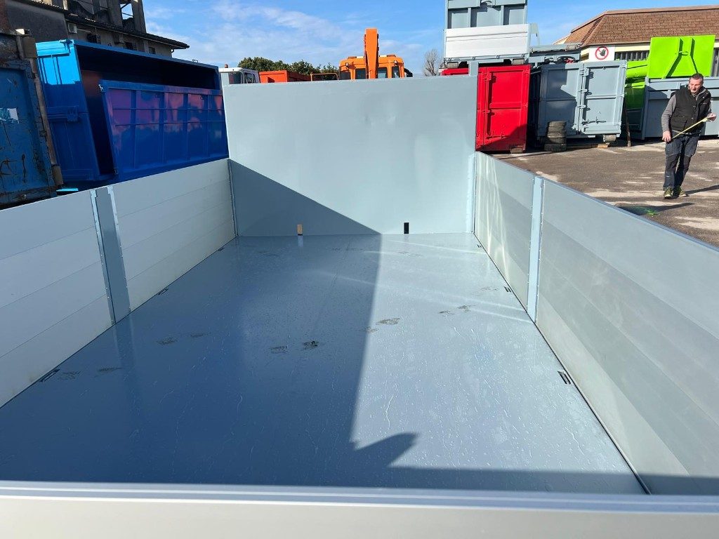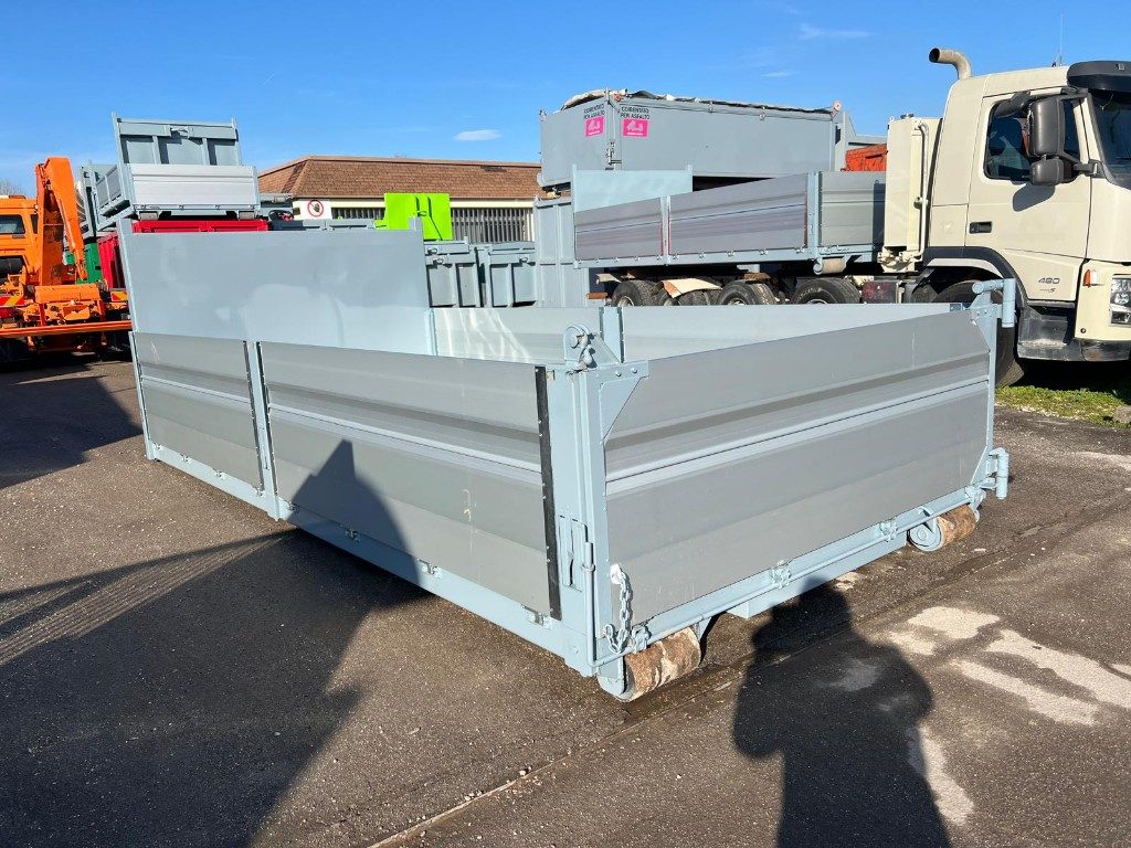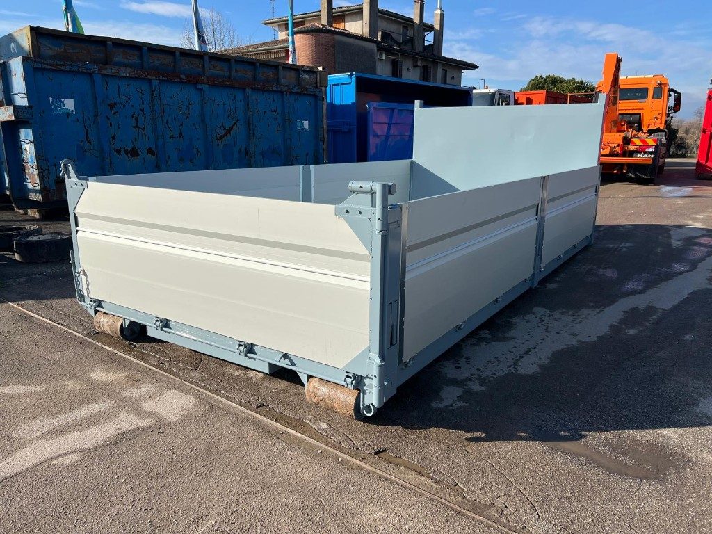 TITOLO: CONTAINER NUOVO SCARRABILE A PIANALE RINFORZATO CON DUE SPONDE PER LATO IN TR1 E SPONDA POSTERIORE IN TR1 DOPPIO EFFETTO, PAVIMENTO IN APPOGGIO ALLE TRAVI DA 180 MM CON 2 GANCI SUPERIORI E INFERIORI A FILO CASSA PIU’ GANCI A SCOMPARSA PERIMETRALI